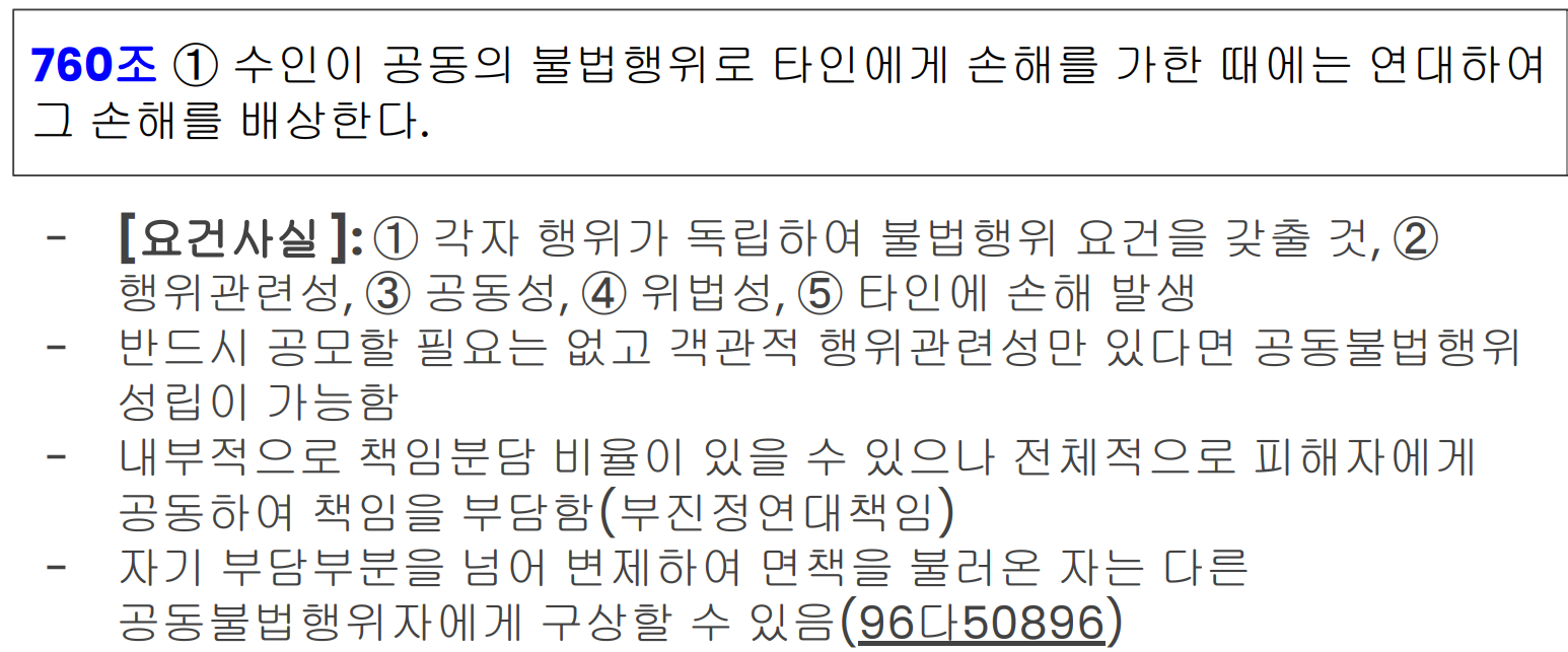 한 명이 잘못한게 아니라 너네 다 잘못했다 이거다 ㅇㅇ.. 여기서 반드시 공모할 필요는 없고 객관적으로 행위 관련성만 있으면 성립한다. 이렇게 행위 관련성이 있는 사람끼리 공동해서 책임을 부담하는 부진정연대책임을 지게되며, 내부적으로 책임 분담을 할 수 있고, 구상권 청구 또한 가능하다.