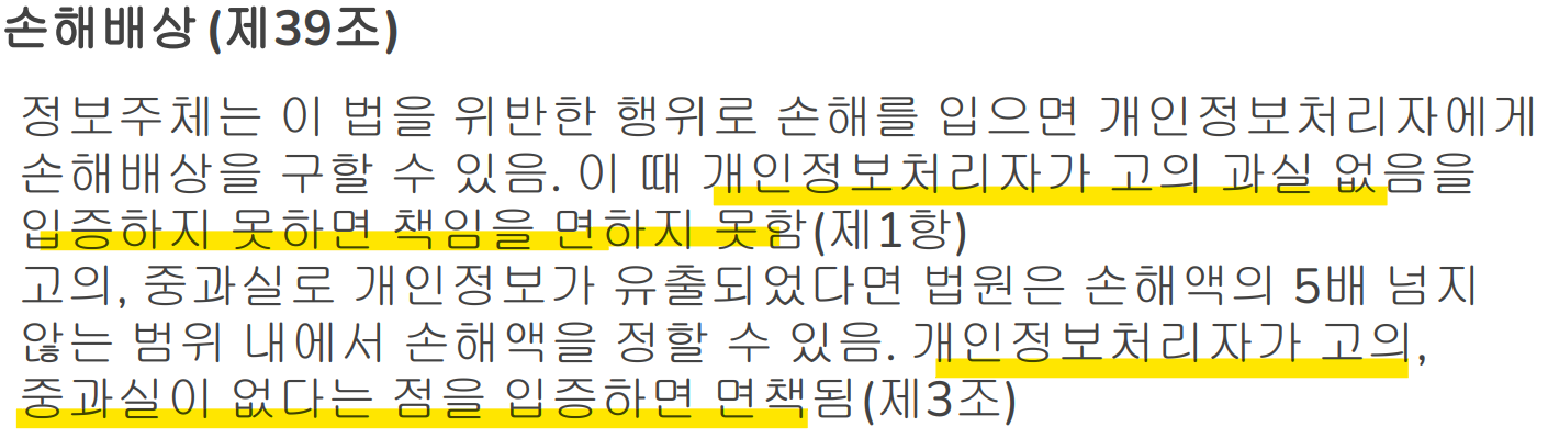 내가 개인정보 관련하여 위반한 행위로 손해를 입었거나, 개인 정보가 유출된 경우 손해 배상 청구가 가능하다. 이 때 개인정보처리자가 고의 및 과실 없음을 입증하면 면책될 수 있다.