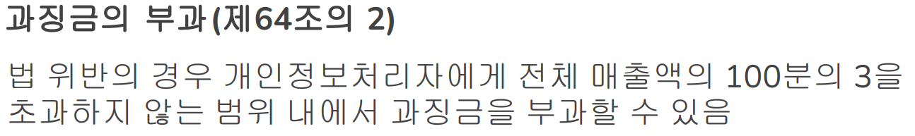 개인정보 관련하여 법을 위반한 경우 전체 매출액 3/100 안쪽에서 과징금 때릴 수 있다.