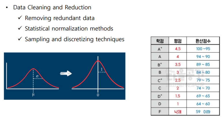 중복 데이터를 제거하거나, 통계적 정규화, 샘플링 및 이산화 기술을 사용한다.