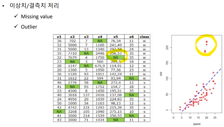 이상치/ 결칙치를 처리한다.(좌: 누락값, 우: 이상치(Outlier) ).