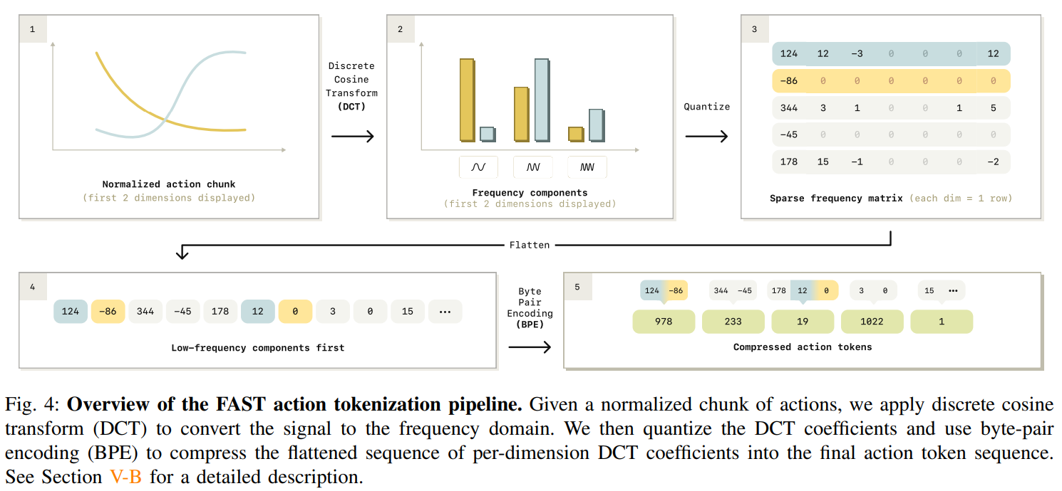 ex. 1초에 100Hz로 제어하려면 100개의 연속적인 액션 벡터 시퀀스 필요함 -> DCT를 사용해 16개의 주파수 성분 토큰