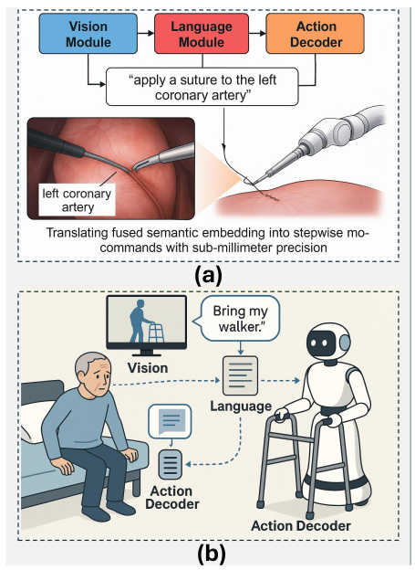 수술 로봇, 환자 보조 시스템 등 의료 환경에서도 VLA는 시각 인식, 언어 이해, 정밀 제어를 실시간으로 통합한다. 예를 들어 RoboNurse-VLA는 음성 명령으로 외과 도구를 넘겨주는 기능을 수행하며, 다양한 조명, 도구, 환경에서도 견고한 성능을 보인다. 자가지도 학습, LoRA 기반 도메인 적응, 장면 기반 설명 가능성이 더해져 의료 인증에도 유리하다.