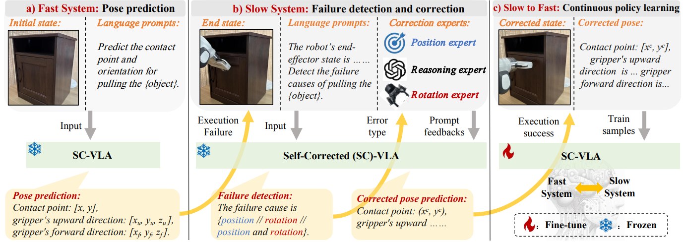 세 번째 VLA 시스템은 이제 단순한 계획과 실행을 넘어서, 자체적으로 실패를 감지하고 수정하는 Self-Correcting 구조까지 갖추고 있다. 예를 들어 SC-VLA는 빠르게 동작하는 경로와 느리게 사고하는 경로를 모두 탑재하여, 실패 감지 시 LLM 등을 통해 원인을 분석하고 대안을 생성한다. 이런 구조는 클러터된 환경에서도 회복력을 높이고, 자율성 높은 로봇 시스템을 가능하게 만든다.