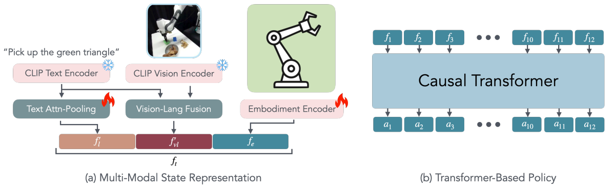 대표적으로 EF-VLA 모델이 있다. CLIP 사전학습에서 얻은 의미 정렬을 그대로 유지하고, 시각-언어 임베딩을 transformer 초기에 융합해 성능과 일반화를 동시에 확보한다.
