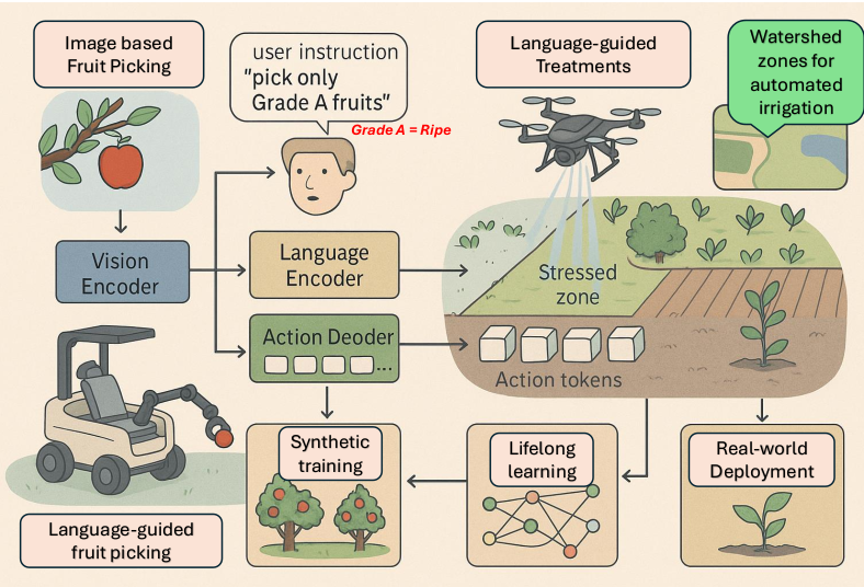 VLA 기반 농업 로봇은 작물 식별, 병해 감지, 선택적 수확 등에서 뛰어난 적응성과 범용성을 보인다. RGB-D, 멀티스펙트럼 영상과 자연어 명령을 통합하여 “관개 트렌치 근처에서 잘 익은 사과만 수확” 같은 작업을 수행한다. 합성 데이터 기반 학습, LoRA, 액션 토큰화, 디퓨전 기반 정책을 통해 다양한 작물, 계절, 지역에도 대응한다.
