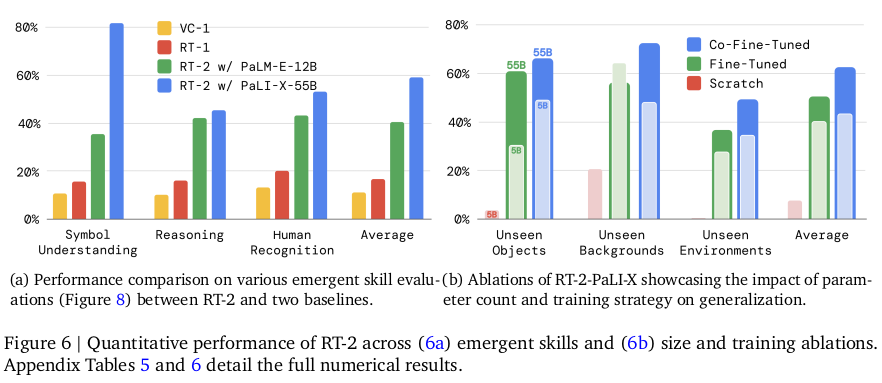 큰 모델을 처음부터 학습하면 성능이 매우 낮아 실용적이지 않고, 반대로 웹 데이터와 로봇 데이터를 함께 사용하는 co-fine-tuning이 일반화에 가장 효과적이었다. 또한 모델 크기가 클수록 일반화 성능도 더 좋았다.