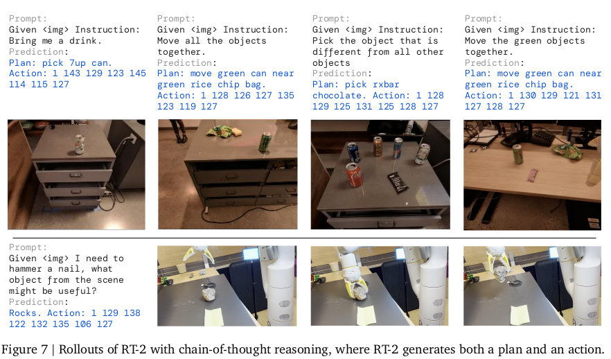 새로운 물체나 다양한 언어 표현에 대한 일반화 성능이 크게 향상될 뿐 아니라, 학습되지 않은 방식으로도 행동을 구성할 수 있는 emergent 능력이 나타난다. 로봇 데이터에 없는 명령도 실행하거나, 이미지 내 객체 관계를 추론해 어떤 물체를 어디에 놓을지 결정하는 식이다. 단순히 배운 동작을 복사하는 것이 아니라, 의미에 기반한 재구성이 가능해진 것이다. 특히 chain-of-thought prompting을 활용하면 고차원적 reasoning도 가능해진다.