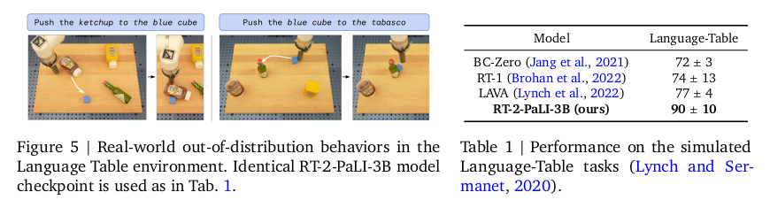 추가적으로, Language Table이라는 시뮬레이션 환경에서도 소형 PaLI-3B를 co-fine-tuning 방식으로 학습시킨 결과 기존 방법들보다 높은 정확도를 기록했다.