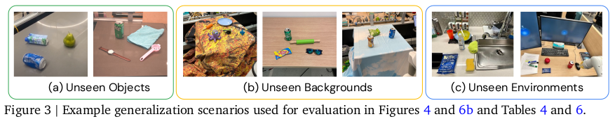 1) 일반화 성능: RT-2는 학습에서 본 적 없는 객체, 배경, 환경에서도 잘 작동하는가?