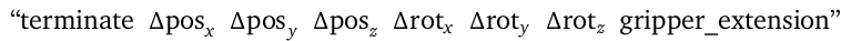 RT-1처럼 로봇 제어를 위한 Action output을 0~255 값을 갖는 256개의 Bin으로 이산화하고, 이를 위 처럼 공백으로 연결한 하나의 문자열로 변환한다. 이를 파인튜닝의 목적으로 사용하면 VLM이 액션을 뱉을 수 있는 VLA로 확장된다. 예시는 다음과 같다.