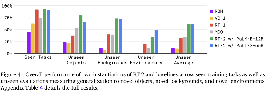 “사과를 3번 위치로 옮겨라”처럼 숫자 인식, “같은 색깔 컵에 사과를 넣어라”처럼 시각적 추론, “안경 쓴 사람에게 콜라를 옮겨라”처럼 사람 인식 등은 로봇 데이터에 등장하지 않았지만, RT-2는 이를 성공적으로 수행한다. RT-2는 RT-1 대비 3배 이상의 평균 성공률을 기록한다
