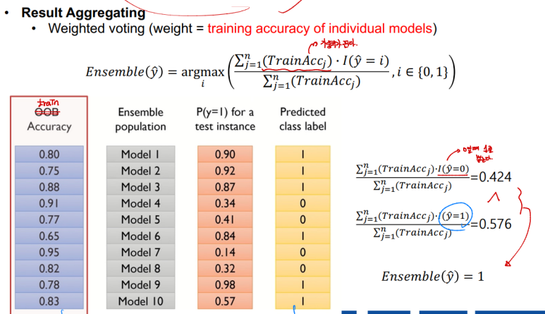 만약에 여기에서 추가 데이터셋 5개를 뽑아 5개의 모델을 만들어 예측을 했는데 모두 train acc가 0.001이고, class 0을 예측했다고 해보자. 앙상블 한 결과 예측값이 0나올 수 있다. 하지만 이건 타당하지 않다.(acc가 매우 작으므로..) 그래서 이러한 훈련 acc를 생각하는 voting 방법은 다음과 같다.