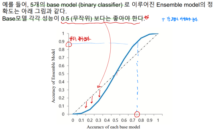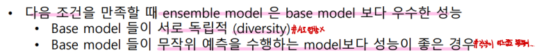 이러한 앙상블 모델이 기본 모델보다 좋으려면 다음 조건을 만족해야한다. # 앙상블 모델 조건**