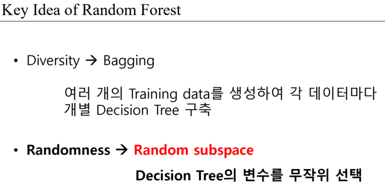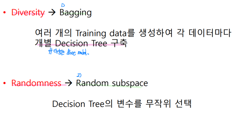 1) Diversity -> Bagging: Random Forest는 다양성을 갖기 위해 Bagging 방법을 사용한다.