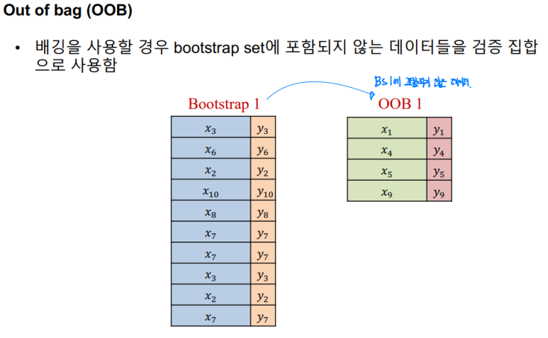1단계) 각각 Bootstrap의 out of bag(OOB)를 구한다. OOB란 원레 데이터셋에는 있지만, 복원 추출한 Bootstrap에는 없는 데이터 포인트를 말한다.