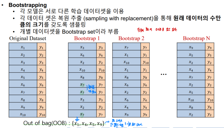 Original Dataset에서 복원 추출을 통해 N개의 개별 데이터셋을 뽑았다. 각 데이터셋을 Bootstrap set이라고 부른다. 각 Bootstrap은 뽑히지 않은 데이터 point에 대한 정보를 갖고 있는다. 이 OOB는 변수의 중요도를 판단할 때 사용된다.