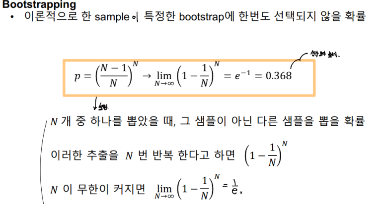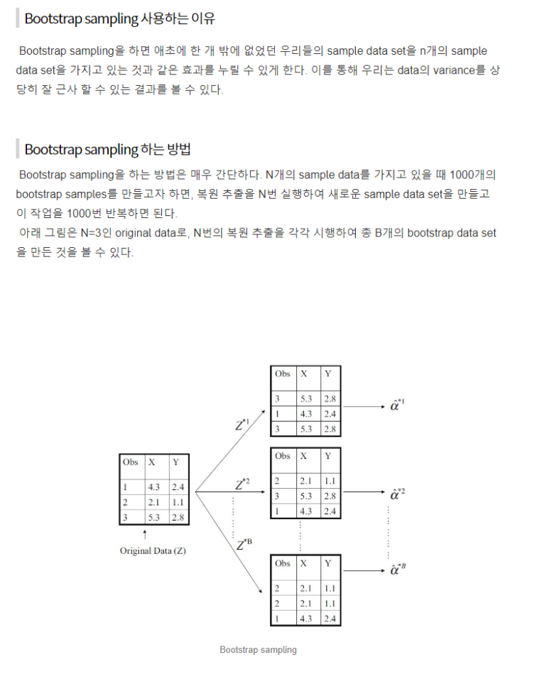 이와 달리 복원 추출을 통해 원레 데이터 수 만큼의 크기를 갖도록 샘플링하는 방법이 Bootstrapping이다.