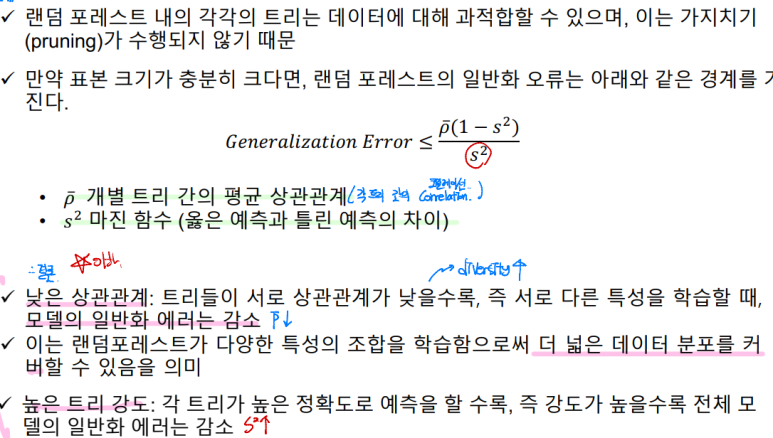 (1) Tree가 서로 상관 관계가 낮을 수록, 다양한 특성의 조합을 학습하여 넓은 데이터 분포를 커버하고, 일반화 에러가 감소한다.