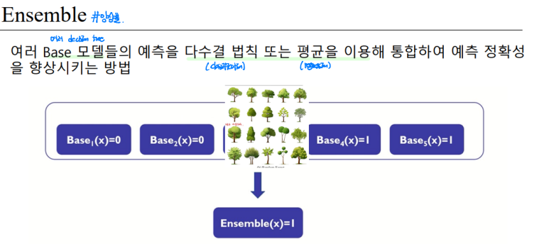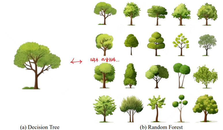 한 결정 트리만 쓰기보다는 여러 결정 트리를 만들어서 때려 넣는 느낌이다.. 이를 앙상블(ensemble)이라고 한다. 앙상블을 통해 만든 모델이 Random Forest이다.