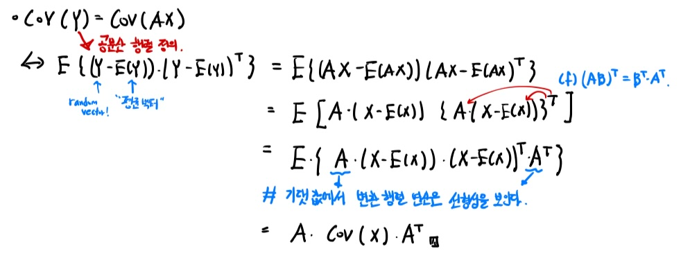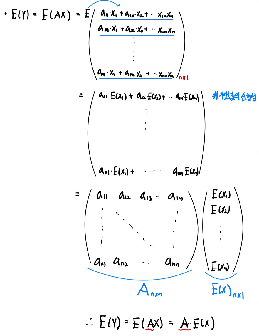 이렇게 선형 변환된 확률 벡터에 대해 다음과 같은 두 공식이 적용된다. 이 각각을 증명하겠다.