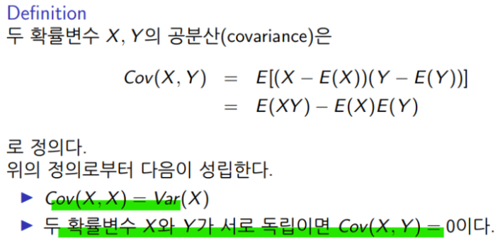 4) 두 확률 변수가 독립이면, 공분산은 0이다.