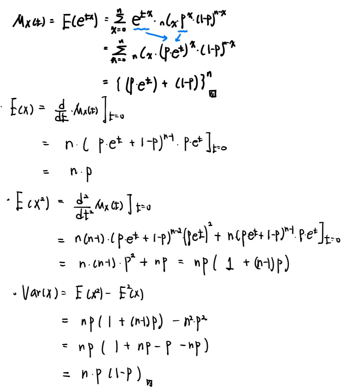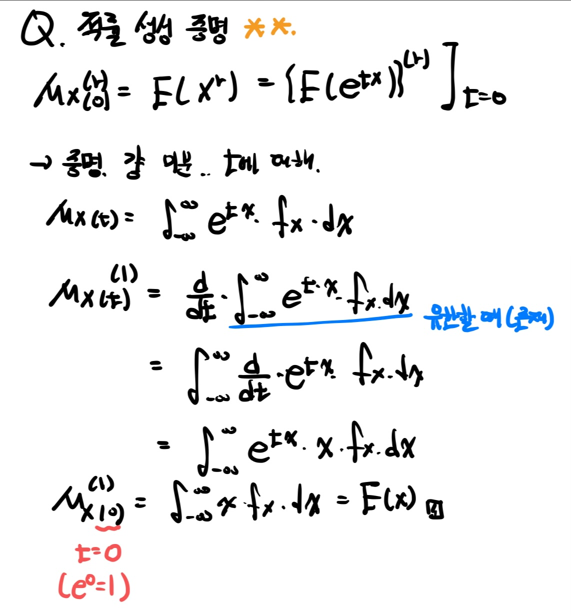(계속 강조하지만, 적률 생성 함수는 t에 대한 함수이다!! 미분은 t에 대해 진행, 0을 대입하는 것도 t에 대입하는 것이다.)