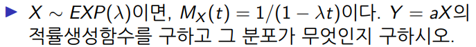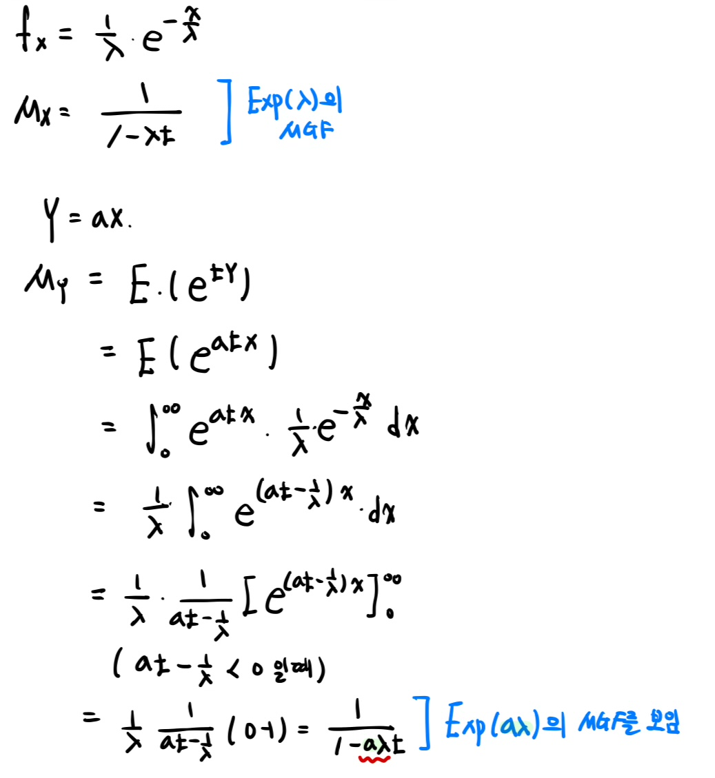 즉 Y ~ EXP(aλ) 이다. EXP(aλ)의 MGF와 Y의 MGF가 같음을 통해 Y의 분포를 보였다.