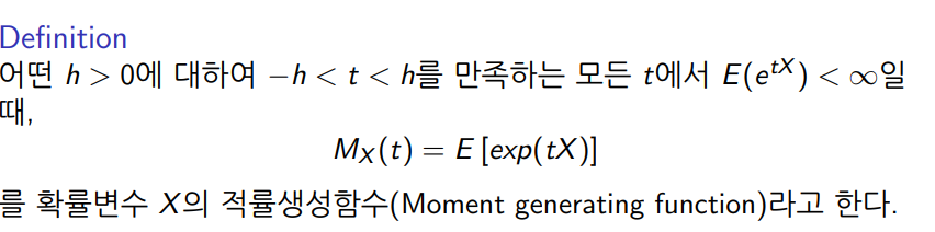 이러한 적률 생성 함수는 E(e^(tX))의 기댓값이 유한(존재)할 때 존재할 수 있다.