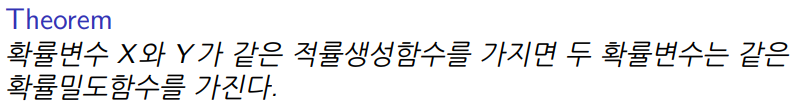다른 활용으로 MGF를 통해 분포를 파악할 수 있다. 만약 두 확률 변수의 MGF가 같다면 같은 pdf를 가진다.