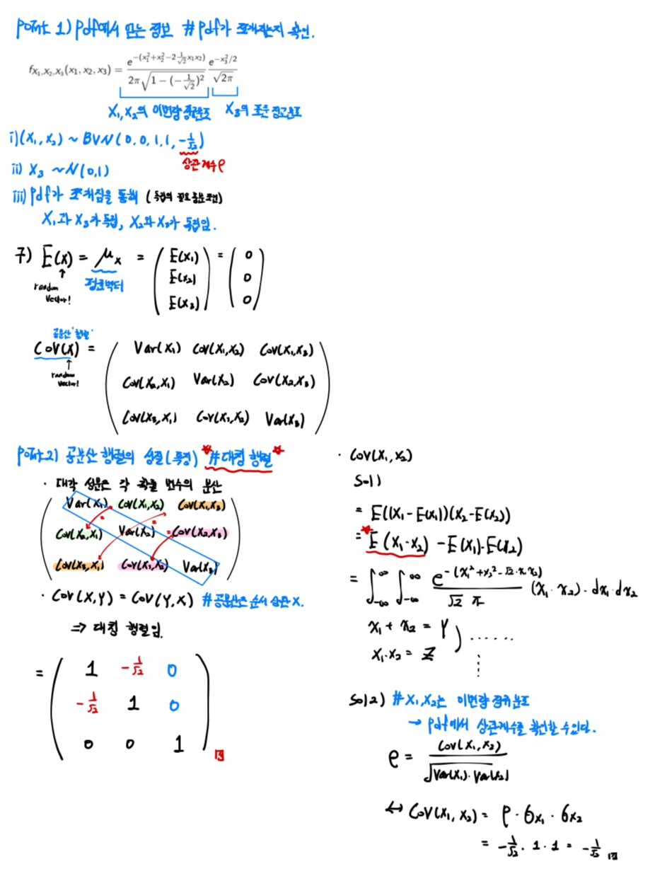 X1, X2 ~ BVN( 0, 0, 1, 1, -1/ 2^(1/2) ), X3 ~N(0, 1)이다. pdf가 쪼개지므로 독립의 필요충분조건에 의해 X1과 X3, X2와 X3는 독립이다. 해당 정보로 이 문제를 해결할 수 있다. 전체 풀이는 다음과 같다.