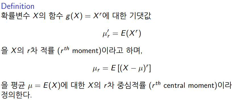 적률은 그냥 확률 변수의 r차의 평균이다. 우리는 분산을 구할 때 E(X^2)을 많이 사용했다. 이것 또한 2차 적률인 것이다.