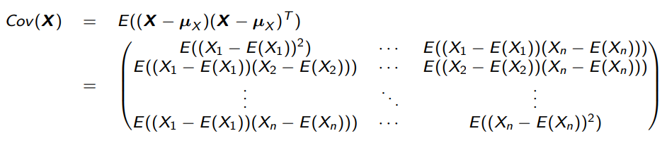 확률 벡터에 대한 공분산이다. 벡터에 대해 연산을 해서 행렬이 나왔다.