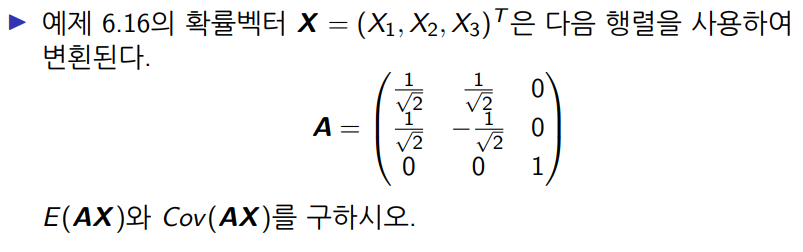 위 6.16 예제에서 구한 E(X)와 COV(X)를 이용하면 된다. 확률 벡터의 선형 변환 공식을 이용하면 간단하게 풀 수 있다.