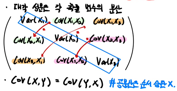 공분산 행렬의 대각성분은 같은 두 확률 변수의 공분산이다. 즉 분산이 될 것이다.