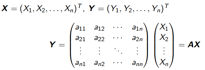 한 확률 벡터(Y)가 어떤 확률 벡터(X)의 선형 변환이라고 하자. 이는 다음과 같이 표현할 수 있다.