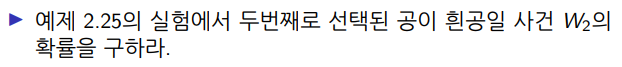 P(W2) = P(W2∩B1) + P(W2∩W1)로 볼 수 있다. B1 과 W1는 전체 표본 공간을 분할하는 배반사건이다. (생각을 해봐라 당연하다.) 이는 전확률 공식으로 인해 P(W2|B1)P(B1) + P(W2|W1)P(W1)으로 구할 수 있다.