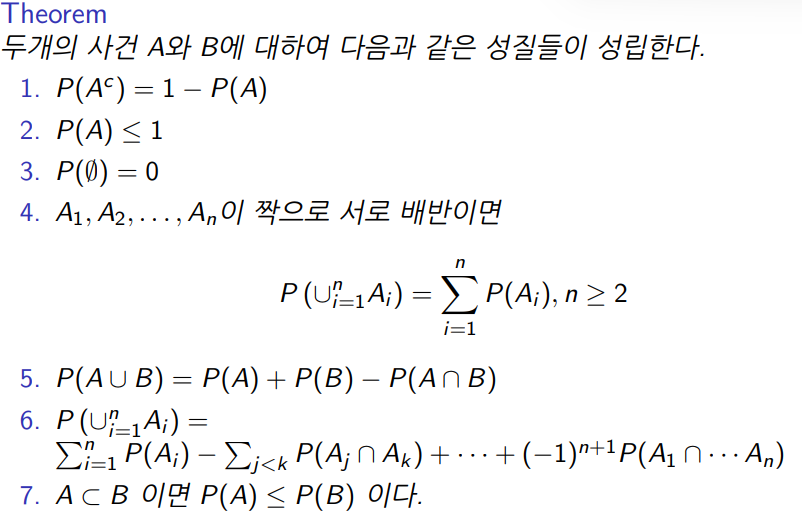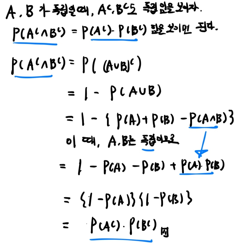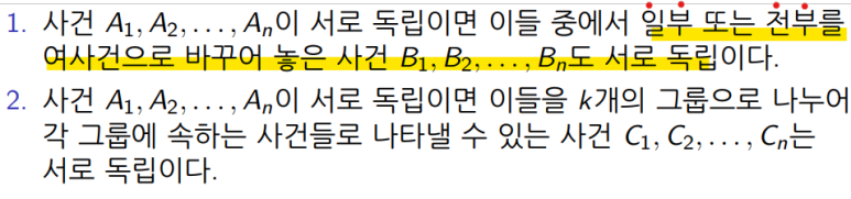 1번 성질 증명을 잘 외워놓자. 드모르간 공식과 곱셈법칙을 통해 증명한다. (약식 증명 사건이 2개일 때만..)