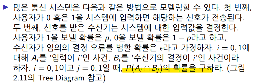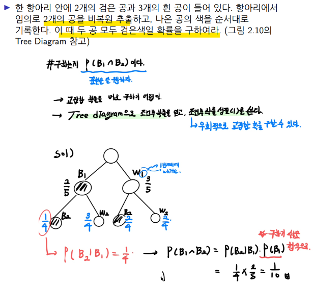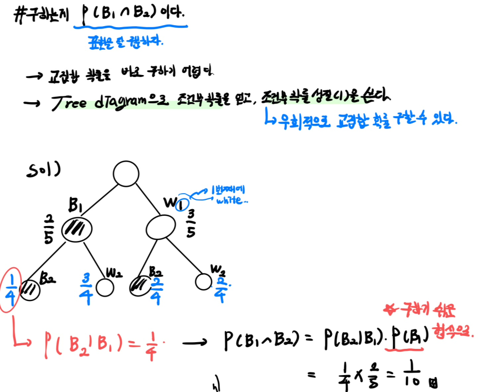 바로 교집합의 확률을 구하기 어렵다. 이 때 Tree Diagram을 그려 조건부 확률을 표현하고, 이를 통해 우회적으로 교집합의 확률을 구한다.