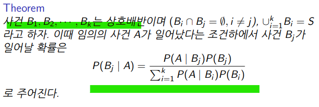 베이즈 정리 또한 전확률 공식이 들어가므로 B가 배반사건이어야 사용할 수 있다. cf) 조건부 확률 성질(2)부터 지금까지 계속 배반 사건의 개념이 들어갔다. 잘 확인하자.