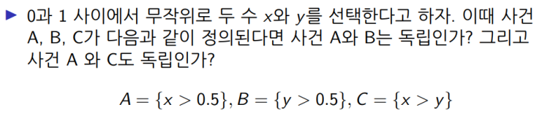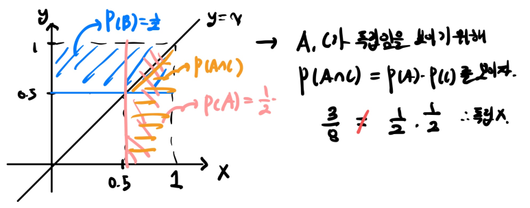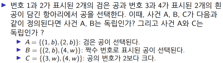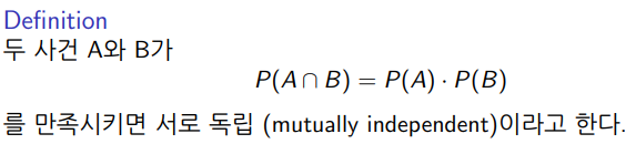 독립의 정의는 매우 쉽다. 두 사건이 독립적으로 일어나 서로 영향을 주지 않는거다. 두 사건이 독립인 걸 보이는건 두 교집합의 확률이 각 확률의 곱과 같음을 보이면 된다. # P(A∩B) = P(A)P(B)
