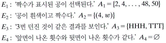 모든 결과를 포함하고 있어 항상 발생하는 확실한 사건과, 결과를 전혀 포함하고 있어 결코 발생하지 않는 불가능한 사건 또는 공사건으로 나뉜다. (걍 그렇군.. 하고 넘어가면 됨.)