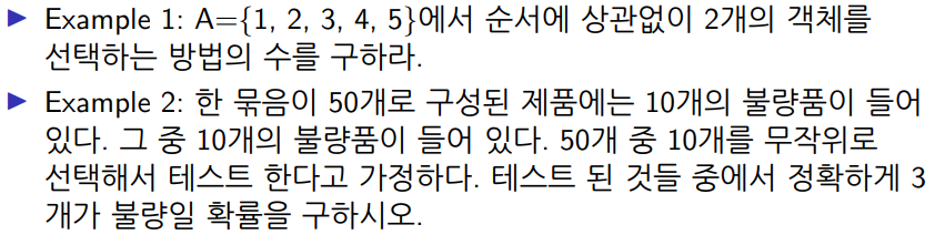*ex2_sol) 한 묶음 50에서 10개를 뽑는데, 정상품 40개에서 7개 그리고 불량품 10개에서 3개를 뽑는 조건부 확률로 보면 좋다. (잘 모르겠으면 걍 유형을 외워라).P = (특정 경우의 수/ 10개를 뽑는 전체 경우의 수)