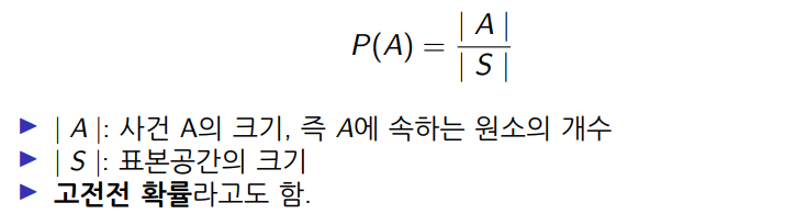 ex) 주사위 눈금이 짝수가 나올 확률.. A = {2, 4, 6}, S = {1, 2, 3, 4, 5, 6} P(A) = |A| / |S| = 3/ 6