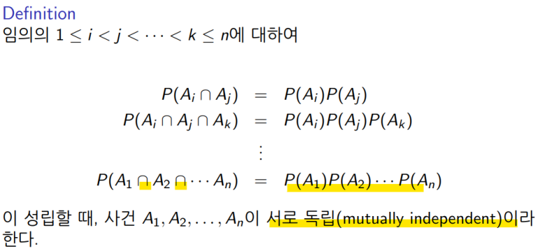 독립 정의의 일반화. 사건이 몇 개든 그냥 교집합과 곱 확률이 같으면 독립이다.