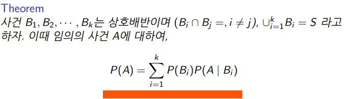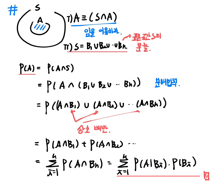 표본 공간이 배분되었을 때(= 조건이 상호 배반일 때) 임의의 사건 A에 대하여, 다음이 만족한다.