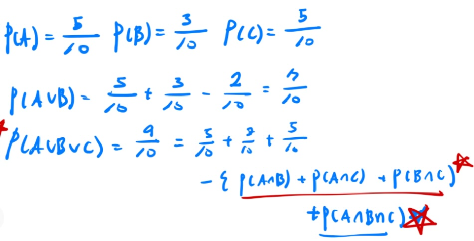 위는 A, B, C의 합집합 원소를 세는 방법이다. 확률도 이와 같이 중복된 교집합에 대해 보정이 필요하다.