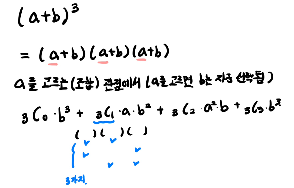이는 조합을 통해 증명할 수 있다. (엄밀한 증명은 아니다. (a+b)^3에서 이항정리 공식과 같음을 보이겠다.)