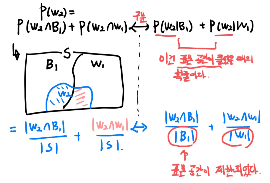 아니 첫 번째 공 검은색이고 두 번째 공 흰색인 거랑 P(W2∩B1) <-> 첫번째 공 검은색일 때, 두번 째 공 흰색인거랑P(W2|B1) 차이가 뭐냐?? 그냥 말만 다르고 같은 의미 아니냐? 생각할 수 있다. 이 차이는 표본 공간을 잘 보면 된다. 확률이 계산되는 표본 공간이 달라진다. (조건부 확률은 표본 공간이 작아진다.)