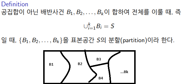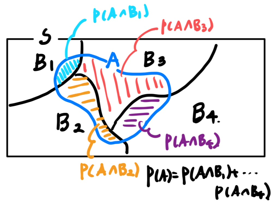 이는 그림으로 더 쉽게 이해할 수 있다. 표본 공간 S를 배반사건 B1, B2 ,B3 ,B4로 분할(partition)했다고 하자.